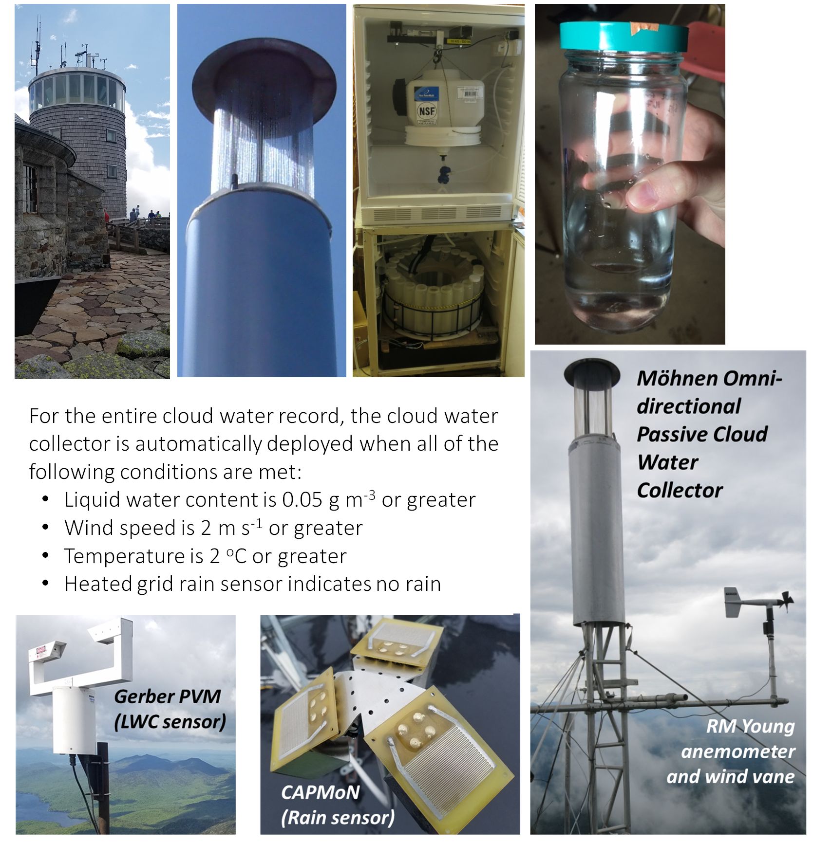 Past research at WFM has focused on chemical reactions leading to acid rain formation, which led to crucial emission control strategies targeting point source emissions of sulfur and nitrogen oxides. Clouds play an important role in converting these gas phase pollutants to condensed phase pollutants (within cloud droplets and aerosol particles). Researchers are now beginning to recognize that clouds can also play an important role in the formation of secondary organic aerosol mass. Organic compounds are a much more difficult class of compounds to predict and control than inorganic compounds, due in part to the mix of anthropogenic and biogenic contributions, the wide range of chemical transformations organics can undertake when exposed to oxidizing pollutants like ozone or hydroxyl radical, and the wide range of conditions (relative humidity, liquid water content and temperature) that aerosol and cloud particles are exposed to in the atmosphere. In spite of their complexities, organics cannot be neglected, as they are a dominant aerosol component. Even while nitrate and sulfate aerosol loadings have dramatically decreased at WFM over the past 25 years (see History), organic aerosol mass loadings have increased (Schwab et al., 2016).